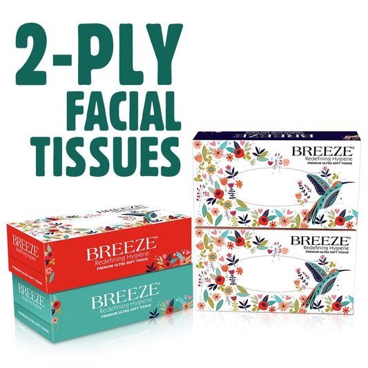 BREEZE BRE021 2 Ply Facial Tissues - Soft & Disposable Wipes for Kitchen, Car, Office & Home - 100 Pulls in Each Box, Pack of 4